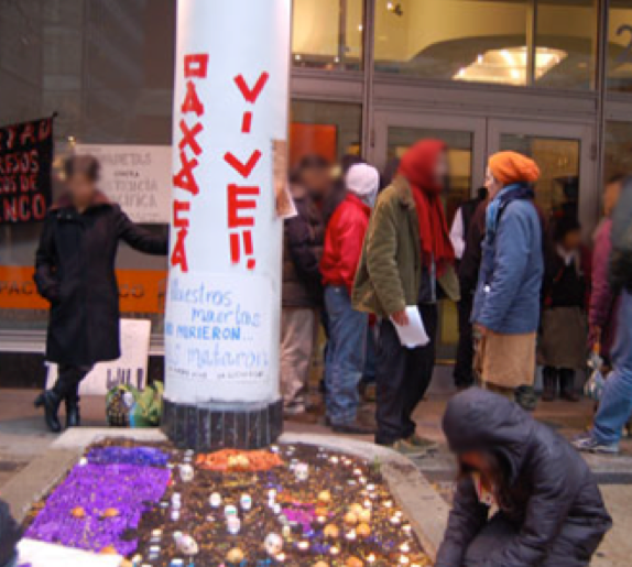 Magdalena arranges the ofrenda (altar) in honour of fallen comrades of the Asamblea Popular de los Pueblos de Oaxaca (APPO) in front of the Mexican consulate in Montreal, Quebec (November 2006); I am found behind her wearing the orange hat, speaking with another member of our collective.