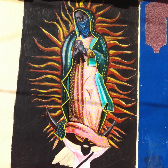 Street art depicting iterations of the Vírgen de Guadelupe, including the “Vírgen de las Barrikadas” popular during the APPO movement. The photos on the left and right were taken in Oaxaca (2010); the middle photograph was taken in San Cristobal de las Casas (2011)—see article for discussion.
