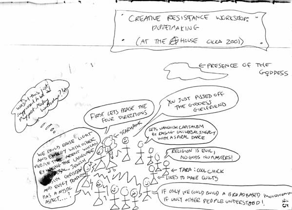“At that same “Creative Resistance” workshop leading up to the FTAA summit in 2001, where the Ya Basta guys popped in to say that we should come glue their foam weapons together because we “weren’t doing anything”, I also said something that inspired a symphony of groans…”